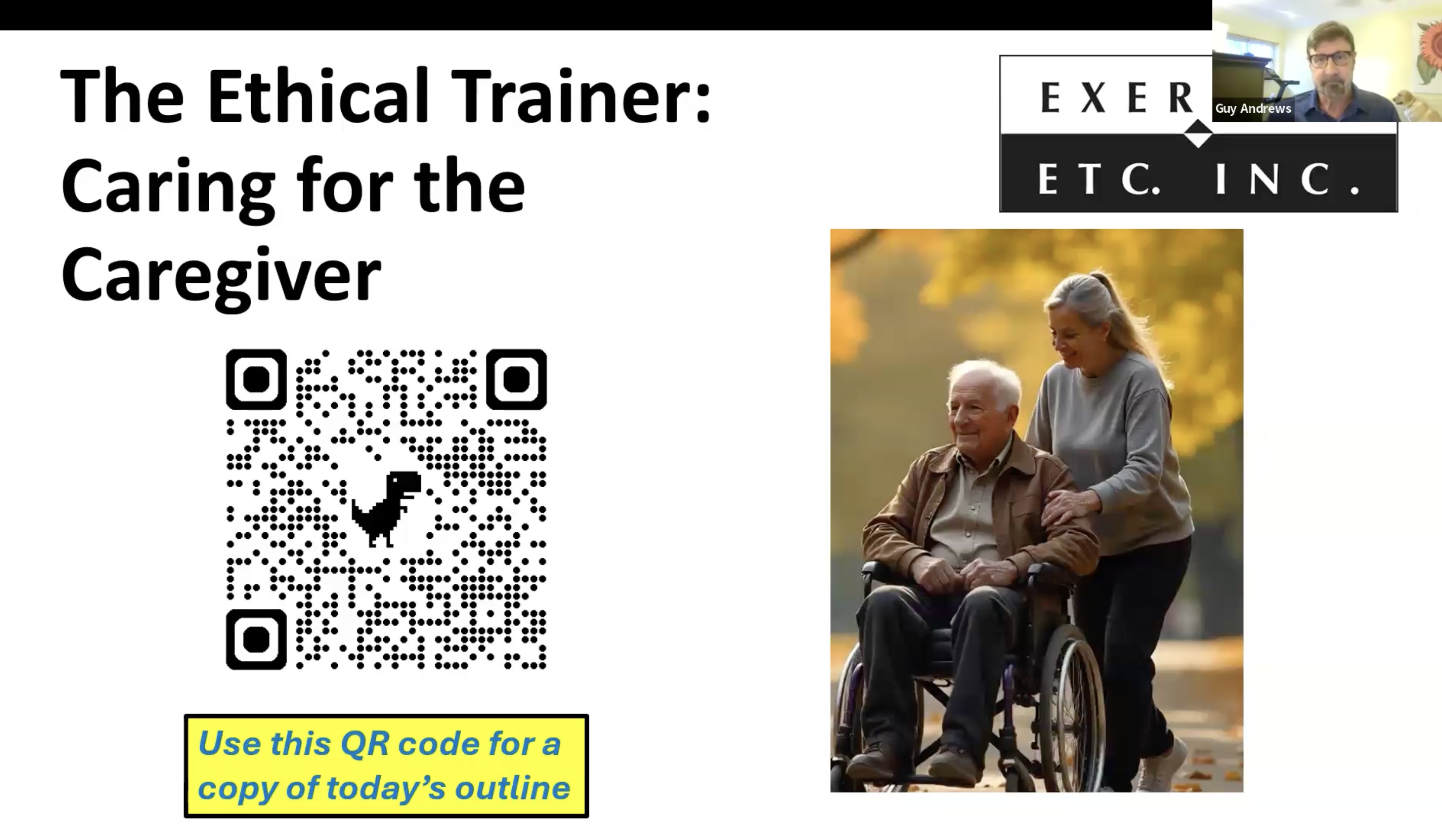 Join Guy Andrews, MA, CSCS of Exercise ETC who was a caregiver for an elderly parent of his own, for this timely webinar that has an unexpected twist. The focus here is on using exercise and activity as coping and healing mechanisms — not for the patient but for the caregivers themselves. As an added bonus, if you are ACE-certified this free, 1-hour webinar is pre-approved by the American Council on Exercise for 0.1 CECs to meet the "Ethics" requirement for your next recertification period. WATCH NOW!